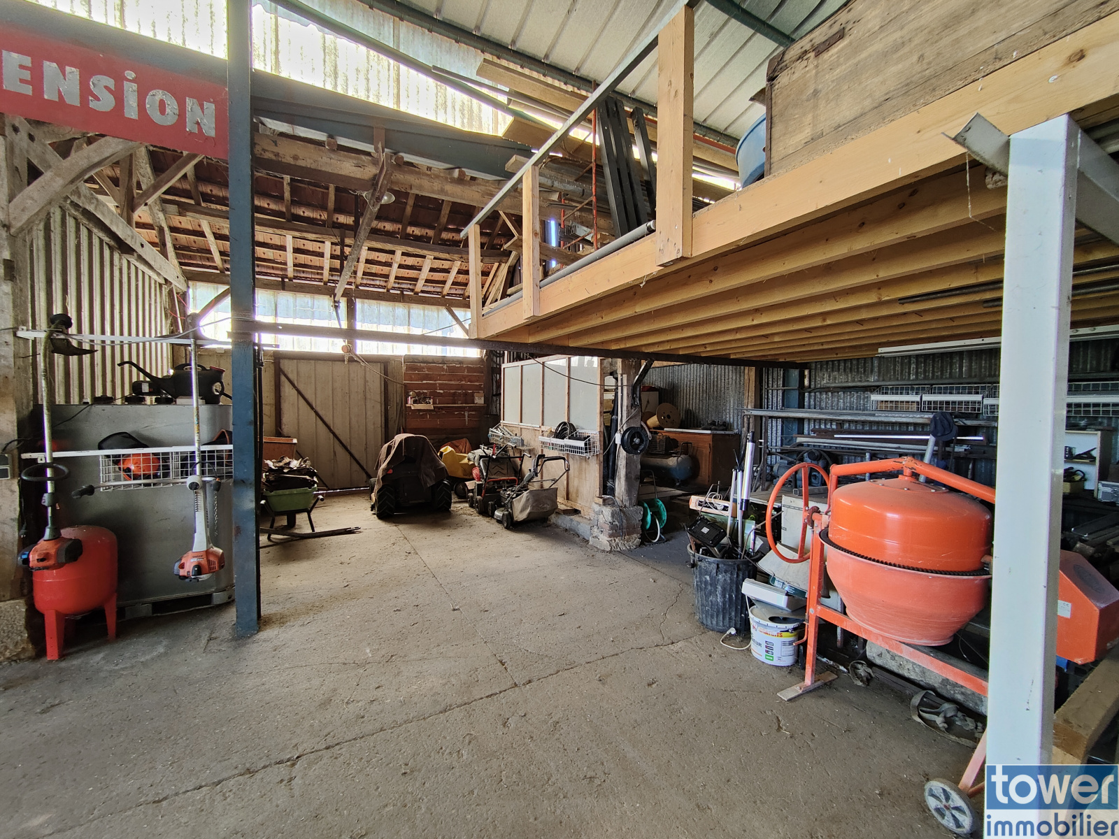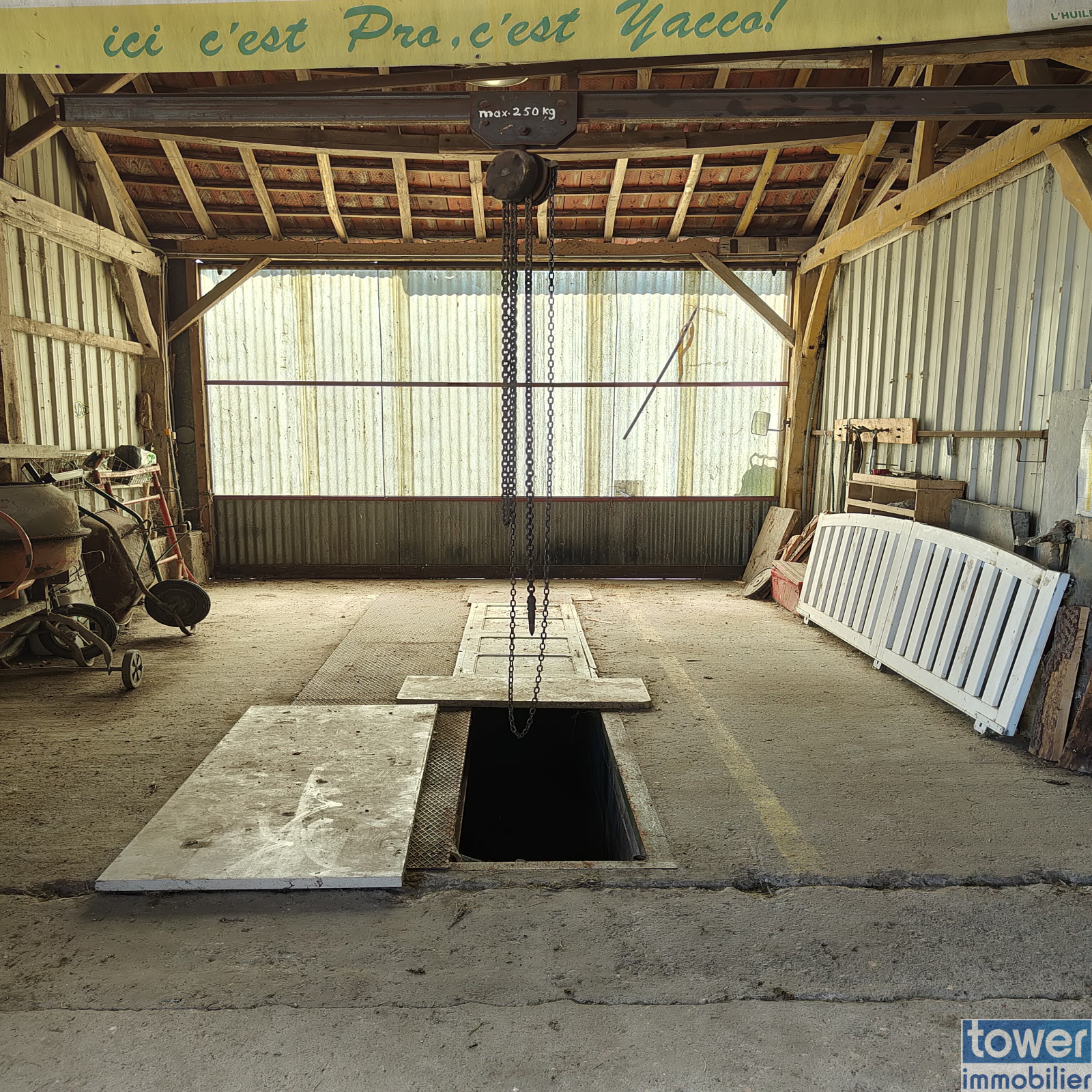 Le hangar de 410 m² fermé bétonné disposant du 380v avec une fosse enterrée pour voiture ,d un atelier, d un bureau d accueil de 20 m² ,d'une mezzanine en bois de 30m².