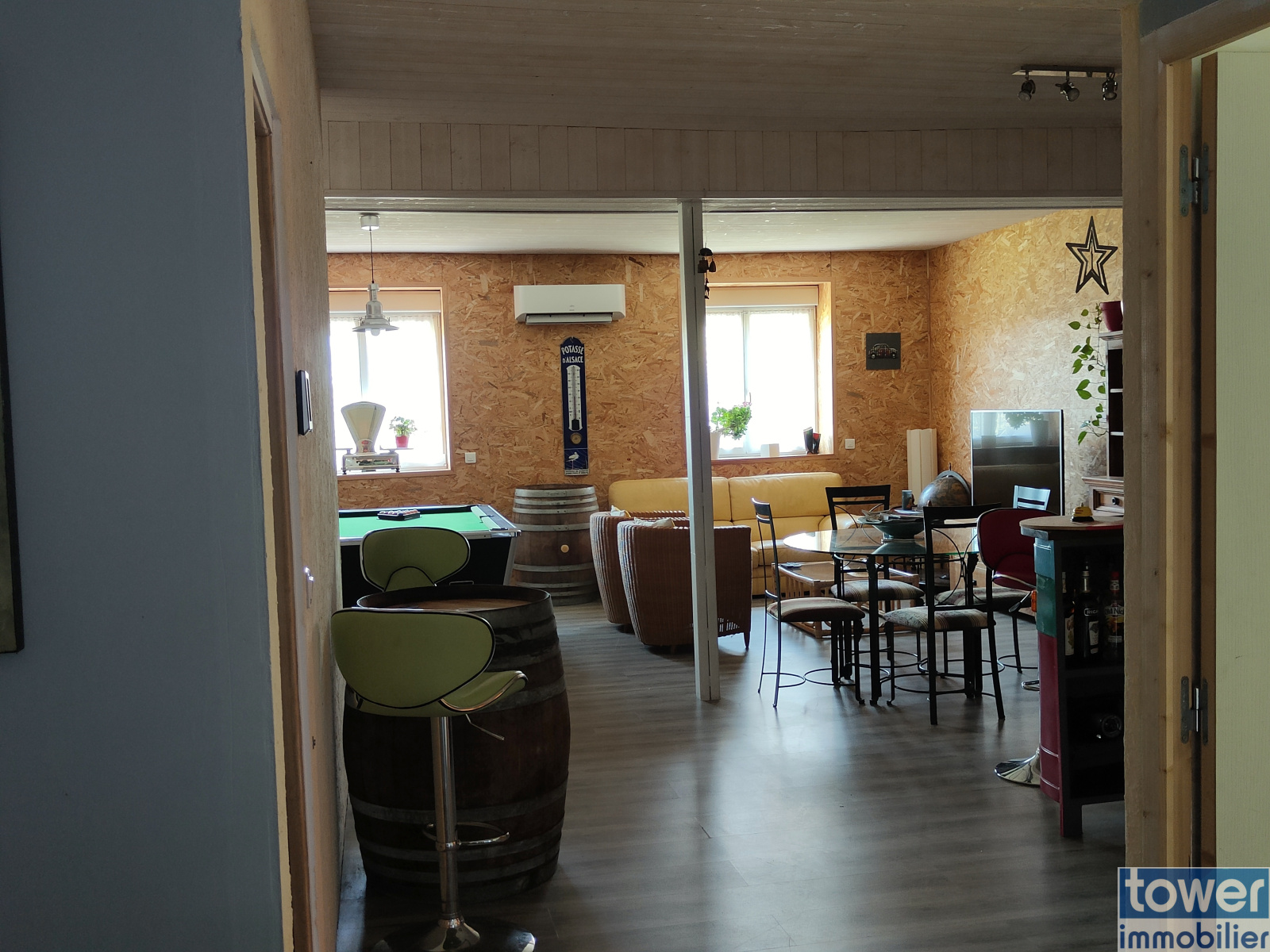 A l'étage un salon climatisé de 45 m², d une chambre avec baignoire et lavabo d une salle de jeu pouvant faire une troisième chambre,un wc.