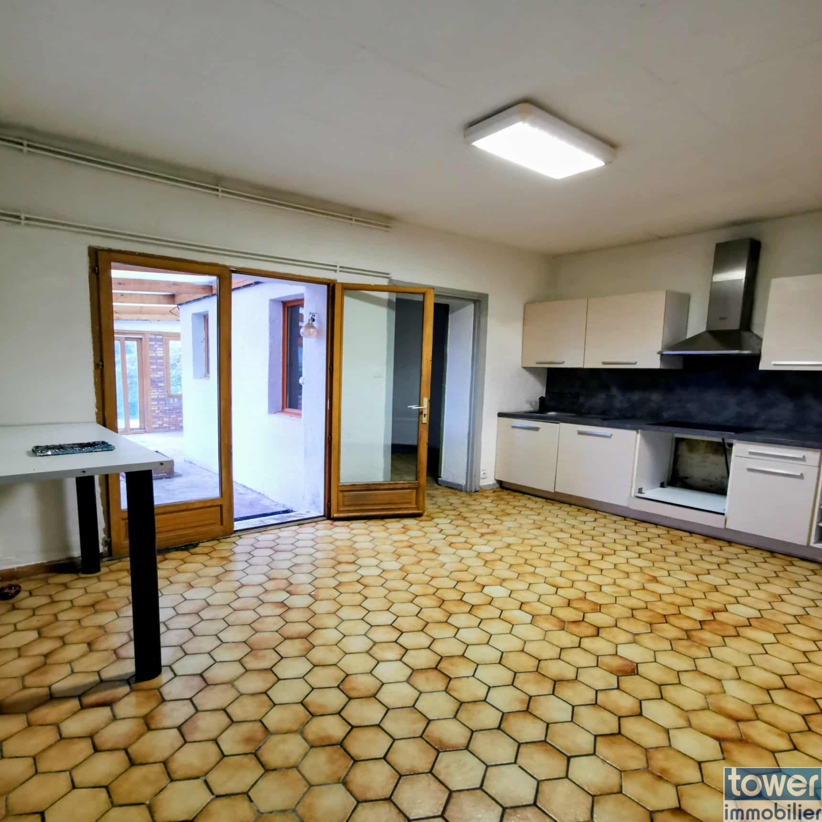 La cuisine fonctionnelle communique avec un espace de rangement et une véranda à finaliser, qui ne demande qu’à devenir un agréable coin détente ou une salle à manger familiale baignée de lumière.
