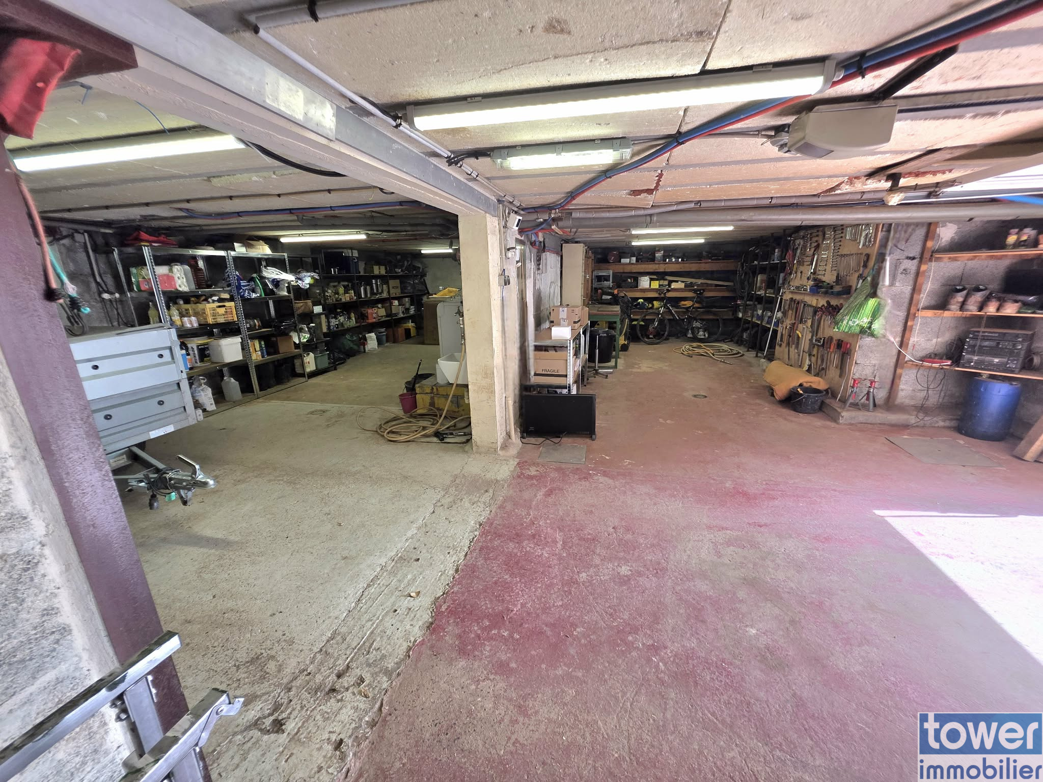 Le bien bénéficie d’un sous-sol complet avec porte de garage motorisée permettant de passer une voiture sous la maison et d’accéder directement à l’arrière du jardin, tout en disposant de beaux espaces de stockage ou atelier.